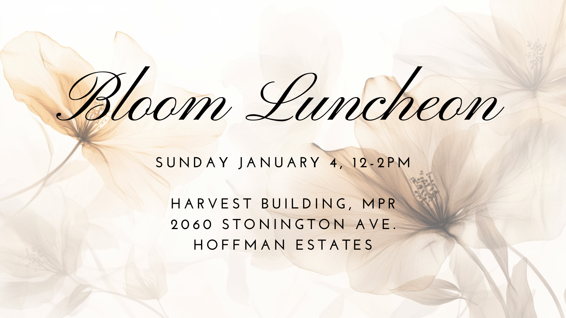 Ladies, please join us for our quarterly Bloom Women’s Luncheon on January 4 from 12-2 PM in the Multipurpose Room of the Harvest Building. Come enjoy a time of fellowship, encouragement, and good food together. We can’t wait to see you there!