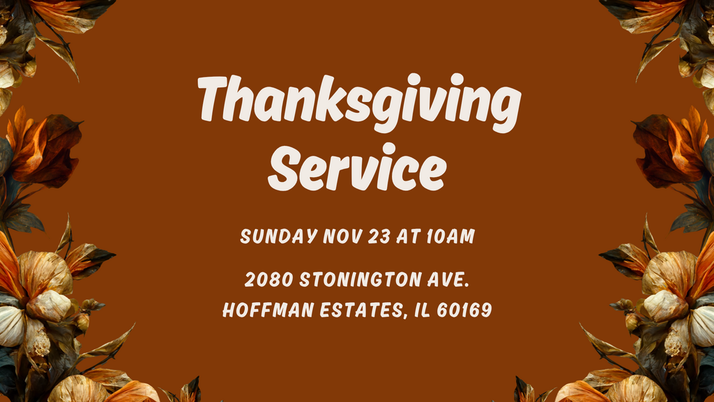 Thanksgiving Service November 23, 2025 10:00 am – 11:30 am Harvest Building 2080 Stonington Ave. Hoffman Estates, IL 60169 Get Directions Please join us for Thanksgiving Service and lunch afterwards! Let us give thanks to God for all that He has done.